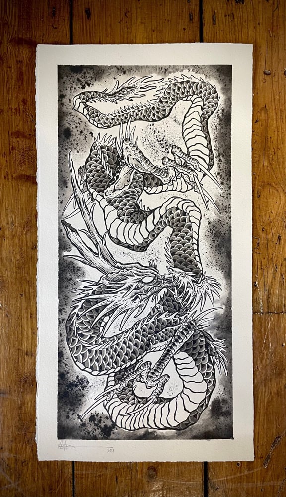 1st prize: an original painting of a dragon worth £250. Made with Indian ink on high quality Somerset Velvet paper, 28x54cm.